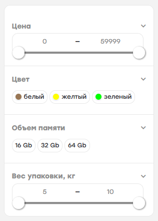 Для быстрого поиска товаров по различным параметрам удобно использовать фильтры. Вот так может выглядеть фильтр в категории товаров на витрине вашего интернет-магазина: